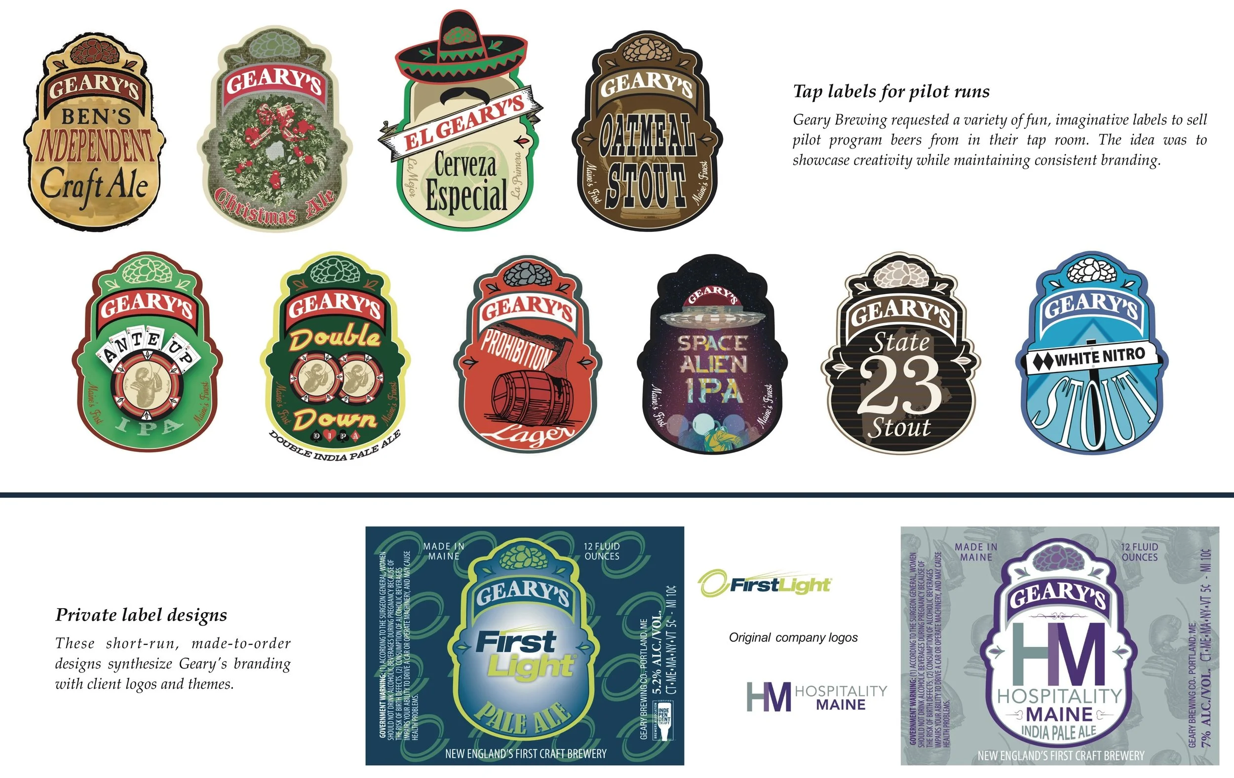 In addition to the core product line, I developed a series of imaginative tap labels for the brewery’s pilot-run beers, giving each small-batch release a creative and playful edge while keeping the overall brand identity unified. I also created short-run private label designs for corporate events, integrating client logos and themes into Geary’s established brand style. This flexible design system allowed Geary Brewing Company to showcase both consistency and creativity across all packaging and promotional materials.