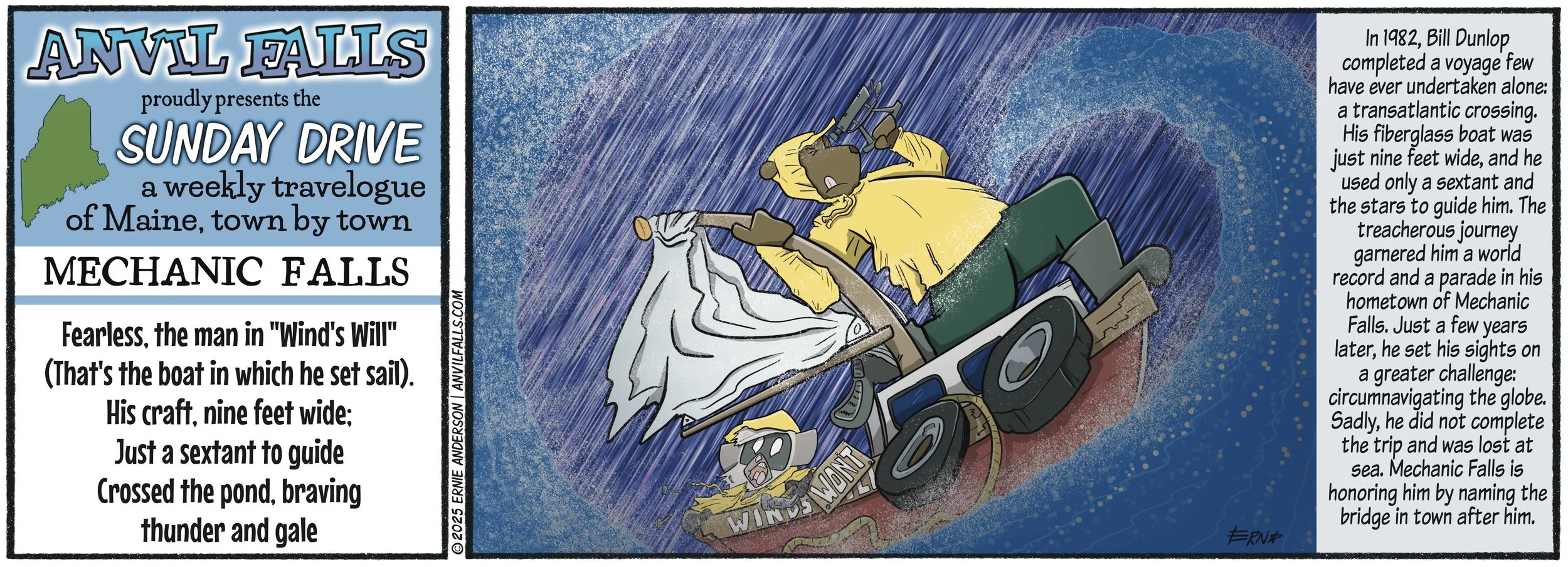 Since its debut in 2022, Anvil Falls has grown into one of Maine’s most widely read local comics. It currently appears in the Lewiston Sun Journal and Central Maine Sunday, and beginning in 2026 will run seven days a week in the state’s four largest newspapers: the Portland Press Herald, the Lewiston Sun Journal, the Augusta Morning Sentinel, and the Kennebec Journal. It also appears monthly in the Harpswell Anchor. Altogether, the strip now reaches more than 40,000 readers in central and western Maine, with that number expected to nearly double in 2026.