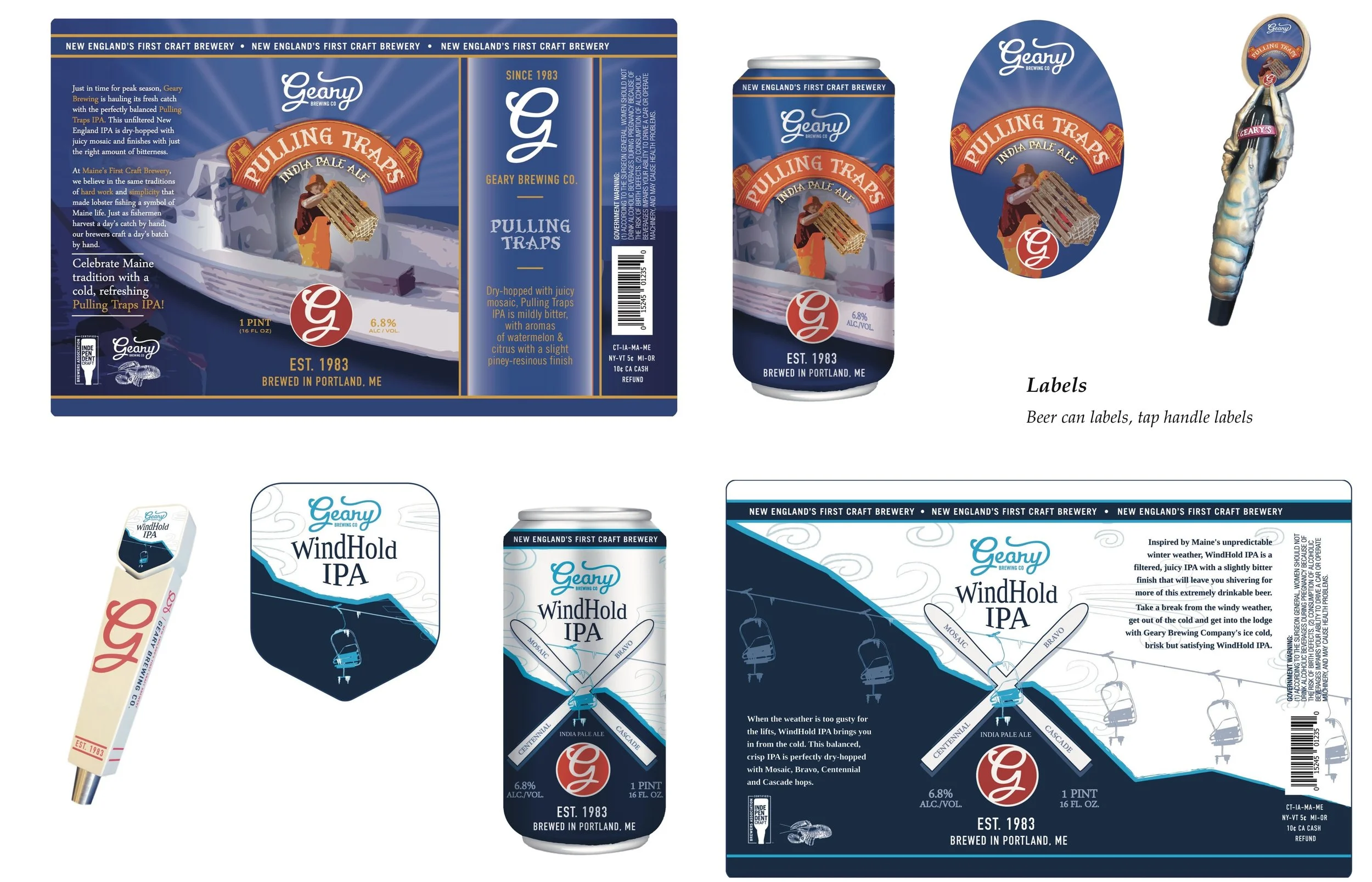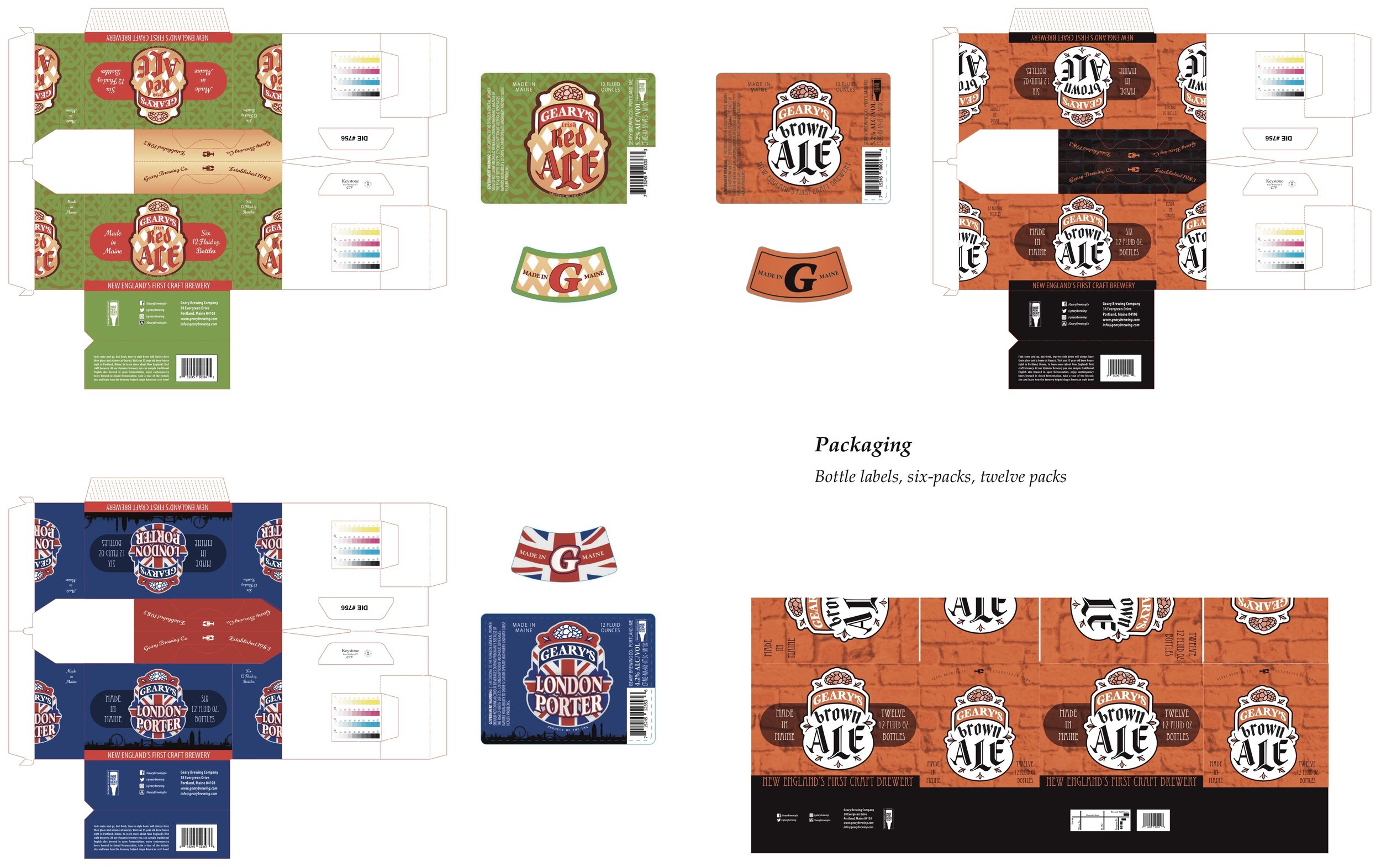 A longstanding New England brewery, Geary Brewing Company sought a refreshed and cohesive visual identity across its expanding product line. I designed a full suite of beer labels, including can and tap handle graphics, as well as packaging for bottles, six-packs, and twelve-packs, using Adobe Illustrator. Maintaining consistent branding while celebrating the distinct character of each brew—such as Geary’s Brown Ale, Irish Red Ale, and London Porter—was central to the project’s success.